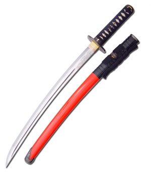 Ręcznie kute wakizashi. Pochwa lakierowana, czerwona. Rękojeść drewniana, pokryta wysokiej jakości skórą, okręcona sznurem z wysokiej jakości japońskiego jedwabiu.